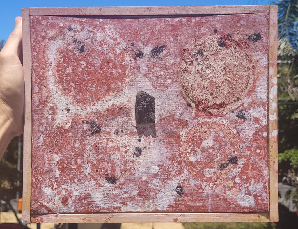 Acrylic paint, oil paint, dew, and fragments of Black Rock igneous/vulcanic stone