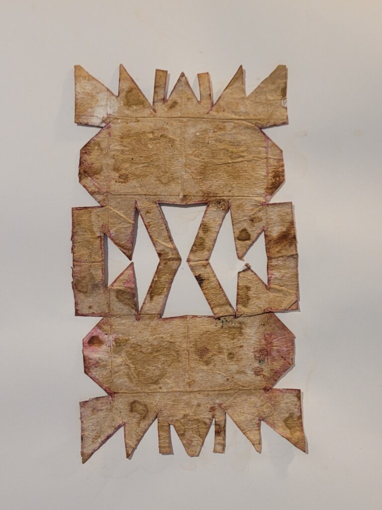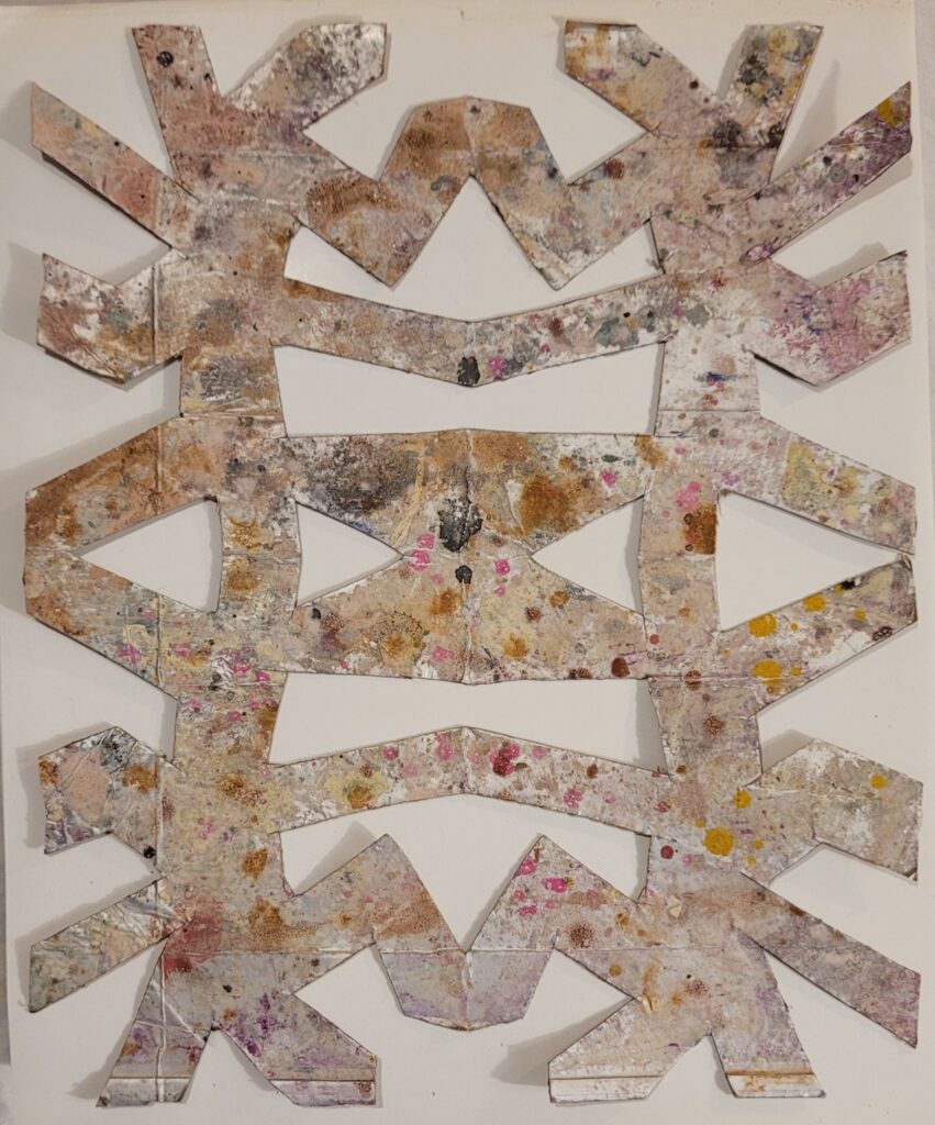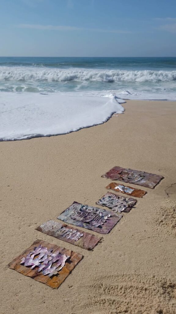 As embalagens dobradas tornaram-se superfície de apoio. Plataformas de equilíbrio num ateliê exíguo. Pisadas para que o corpo pudesse alcançar a tela. Restos industriais transformados em prótese pictórica. Mais tarde, levadas ao mar. O sal acumulando cristais. A corrosão escrevendo uma segunda camada sobre a primeira. O ferro que alisa. O papel fotográfico que reflete. Opacidade contra brilho. Aspereza contra superfície polida.