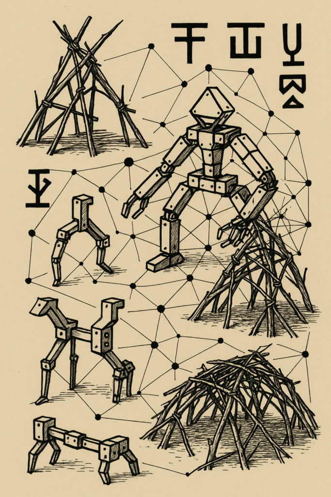 Shelter e robótica modular apresentam um parentesco estrutural. Barras soltas que se acoplam. Módulos que se reorganizam. Sistemas que se constroem a partir do que encontram. Autopoiesis como princípio operativo. Simpoiesis* como condição inevitável. Nenhuma forma existe isolada. Toda forma depende do ambiente, do vento, da gravidade, do outro módulo, do outro corpo.
