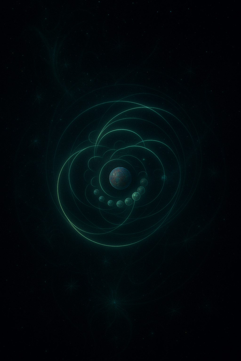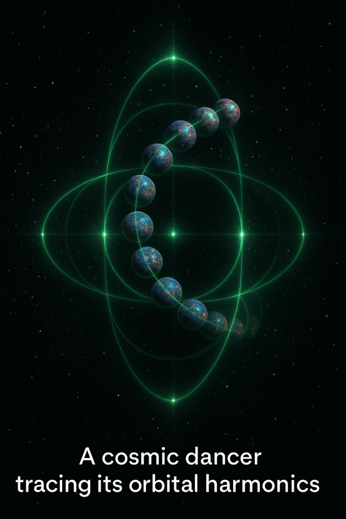 A segunda imagem muda da curvatura estática para a coreografia dinâmica . Aqui a esfera é capturada em um ritmo orbital , movendo-se como se fosse uma dançarina cósmica em movimento perpétuo. Imaginamos a esfera várias vezes ao longo de um caminho circular – ecoando a si mesma – para transmitir movimento, muito parecido com uma fotografia de longa exposição de uma dançarina girando com uma luz. O conceito se inspira em danças celestiais reais: por exemplo, alguns exoplanetas foram encontrados orbitando em um ritmo ressonante , influenciando uns aos outros como parceiros em uma valsa. Em uma descoberta recente, dois planetas estavam “ligados em uma órbita rítmica – se afastando e, em seguida, voltando lentamente a se unir, como dançarinos tecendo um ao redor do outro em um palco cósmico” [8] . Nossa imagem canaliza essa ideia ao descrever a órbita da esfera como um círculo ritual , com indícios de um brilho residual para marcar sua jornada periódica. O caminho da esfera não está sozinho: um tênue traço secundário ou companheiro pode ser visto, sugerindo um parceiro ou influência invisível – muito parecido com uma lua menor ou uma força invisível puxando a esfera principal. Isso reflete como em ressonâncias orbitais, dois corpos trocam puxões gravitacionais em intervalos regulares, mantendo o tempo como batidas na música. (Na verdade, ressonância orbital em astronomia se refere a corpos orbitais exercendo influência regular e periódica um sobre o outro devido a simples razões inteiras de seus períodos [9] .) Enfatizamos o ritmo usando curvas repetidas e talvez notações musicais sutis embutidas no fundo estrelado, implicando que a gravidade tem seus harmônicos . A esfera aqui se torna um substituto para um planeta, e a parede ou cenário de estúdio se dissolve inteiramente em um cosmos estrelado – agora é iluminada por um sol distante, lançando um brilho ritualístico em sua superfície. Os harmônicos invisíveis surgem como padrões simétricos na escuridão, talvez poeira rodopiante ou formas semelhantes a anéis que ecoam a órbita da esfera. Há uma sensação de uma “dança cósmica” : a esfera orbita um centro implícito (talvez um corpo mais pesado invisível ou um ponto no espaço) e, ao fazer isso, executa uma dança de repetição e variação. Isso ressoa com a forma como, por exemplo, as luas de Júpiter, Io, Europa e Ganimedes, estão presas em um ritmo 1:2:4, ou como os planetas KOI-134 recém-descobertos circulam em um ritmo 2:1 – um orbitando duas vezes por cada um dos outros [10] [11] . Celebramos visualmente isso ao fazer com que nossa esfera deixe um rastro luminoso verde (como na imagem conceitual do KOI-134) para marcar uma órbita completa, e então um segundo loop fraco dentro dela para marcar as duas órbitas do parceiro mais rápido. O resultado é um padrão de loops que lembra um desenho de espirógrafo ou uma mandala celestial desenhada pela gravidade. Esta imagem do Ritmo Orbital retrata a gravidade como cíclica e musical . É a gravidade como relação e dança : a esfera e seu parceiro invisível mantêm uma sincronia que é tanto física (seguindo as leis de Kepler) quanto poética (como um ritual ou “balé cósmico” ). Ao visualizar a esfera como uma “dançarina cósmica”, destacamos que até mesmo uma massa simples pode participar da grande coreografia do cosmos, guiada pelas harmônicas invisíveis do espaço-tempo.